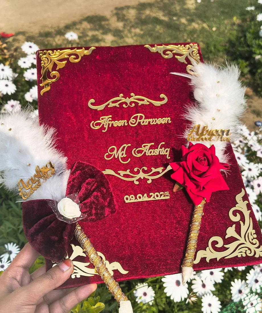 This luxury set includes a hand-designed Nikah Nama booklet with space for all ceremony details, placed inside a custom box engraved with the couple’s names — a timeless reminder of your union.
